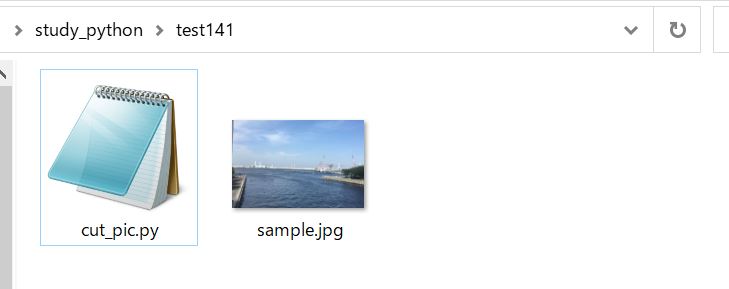 (cut_pic.pyが先ほどのコードが書かれたファイル、sample.jpgがこれから切り抜くベース画像です。)