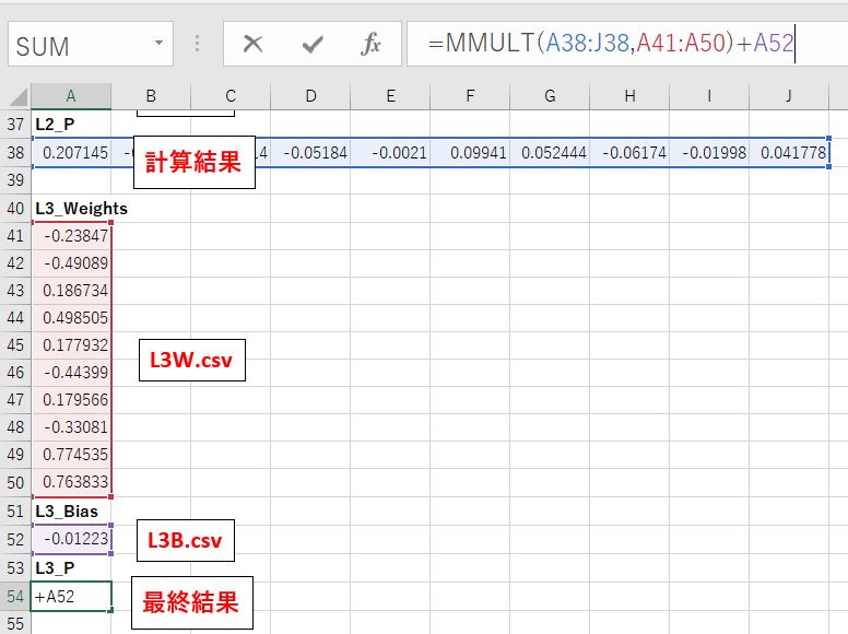 複雑そうに思えるかもしれませんが、ニューラルネットワークの計算は行列の積と和ですので、こんな感じでエクセルだけでも再現できるというわけですね。