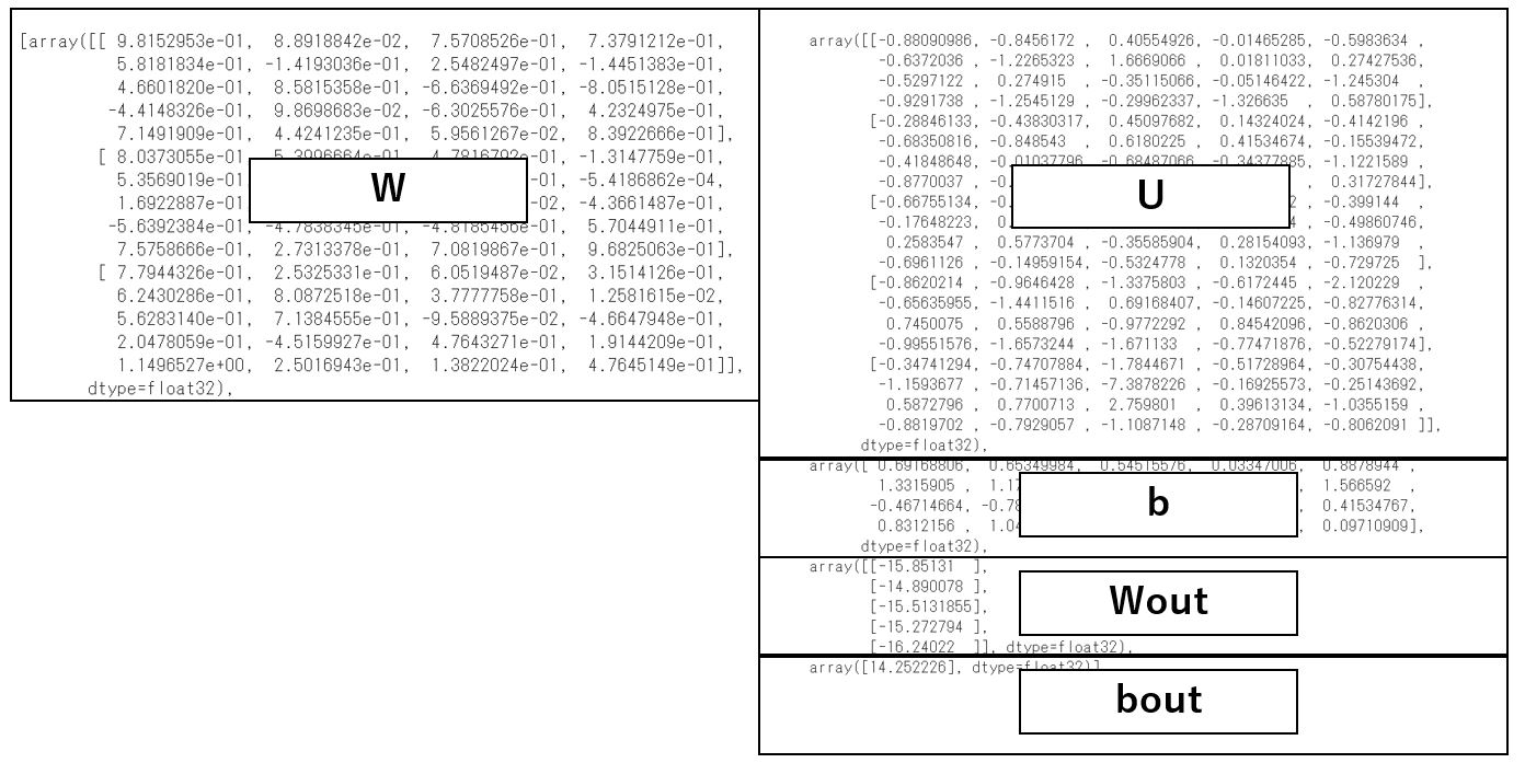 今回着目したい重み&バイアスですが、上の画像でいうとW,Uが重み、bがバイアスです。
