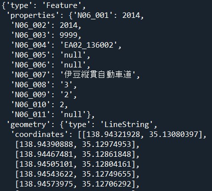 今回はroad_dataという変数に先ほどのgeojsonファイルの中身を格納していますので以下のように確認してみます。