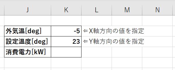 この状態から軸上に数値がない、外気温ー5度&設定温度23度のときの消費電力を求めたい、という状況で活用できるスキルになります。